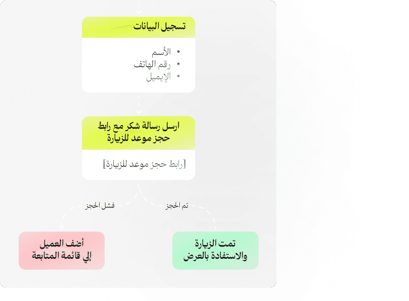 إعداد رسائل تلقائية تُرسل للعملاء عند انتقالهم من مرحلة إلى أخرى. إعداد سيناريوهات متابعة تلقائية عند تأخر العملاء في المسار. أتمتة إنشاء المهام للفريق بمجرد تقدم العميل، مما يقلل من الأخطاء ويوفر الوقت.