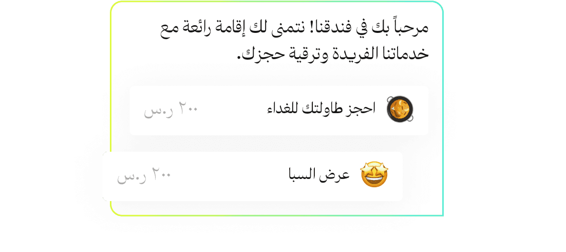 إرسال رسائل ترحيب تلقائية عند تسجيل النزيل دخوله، تتضمن عروضًا مخصصة على تجارب الفندق مثل المطاعم، السبا، أو نادي الاطفال.