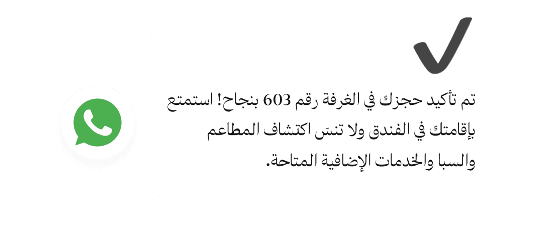 تُرسل رسالة تأكيد عبر واتساب تتضمن تفاصيل الإقامة والخدمات الإضافية المقترحة مثل المطاعم والسبا.
