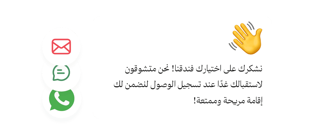 إرسال رسائل تذكير تلقائية للنزلاء قبل موعد الوصول، مع اقتراحات للخدمات الفندقية المتاحة مثل المطاعم والسبا.