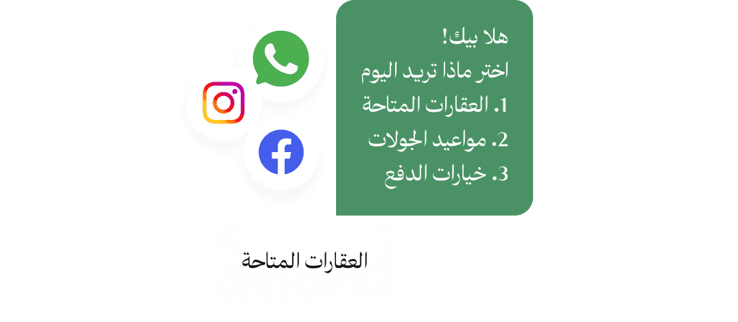 استقبال الطلبات عبر واتساب، انستقرام، وفيسبوك مع ردود ذكية تشمل تفاصيل العقارات، المواعيد المتاحة، وخيارات الدفع.